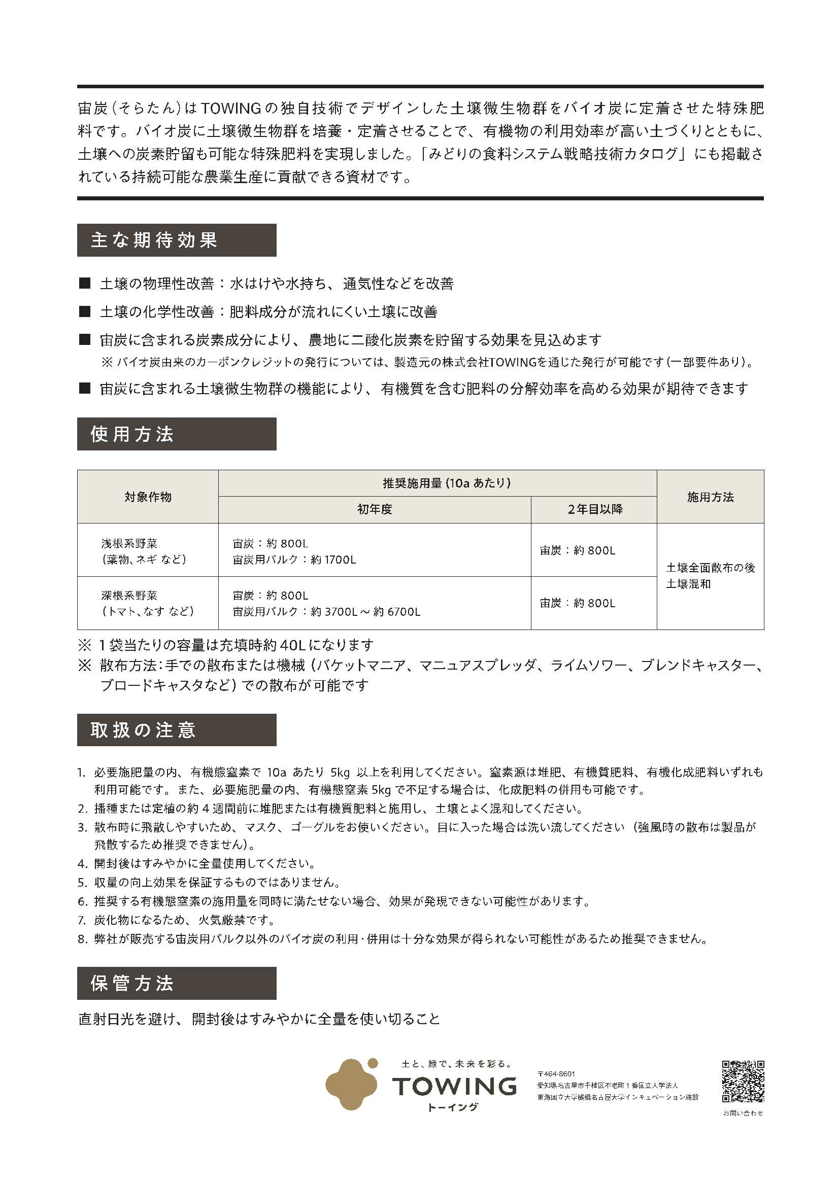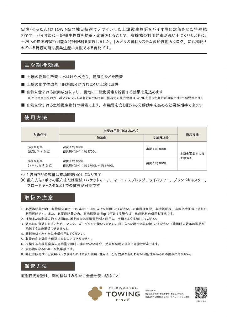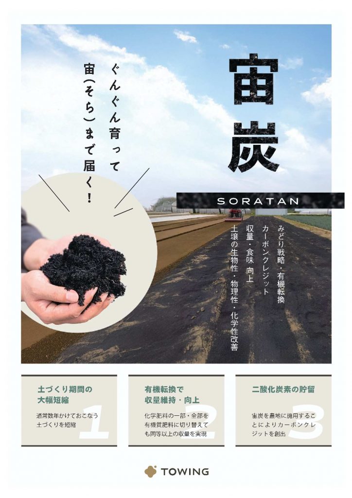 宙炭(そらたん)とは、TOWINGの独自技術でデザインした土壌微生物群をバイオ炭に定着させた特殊肥料です。